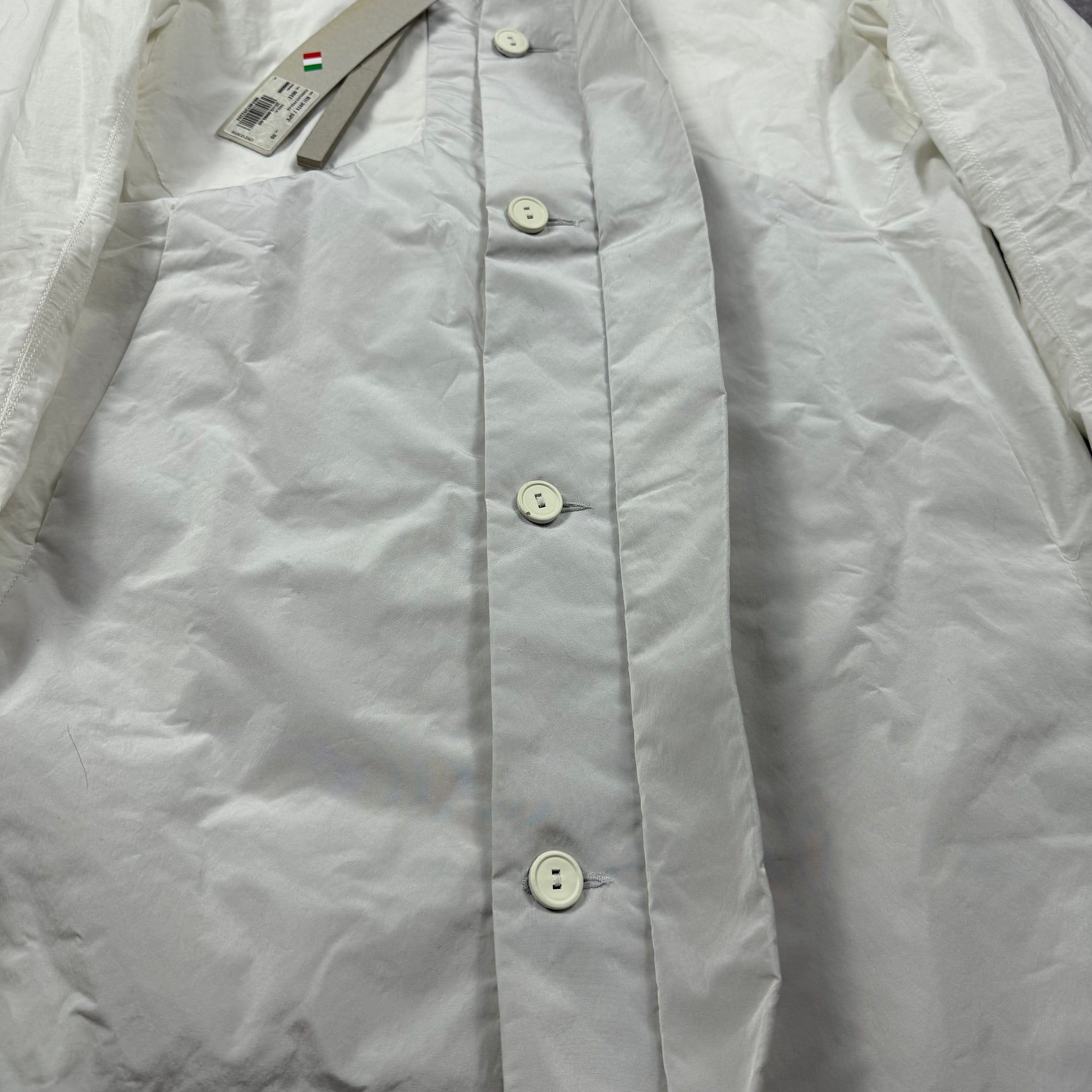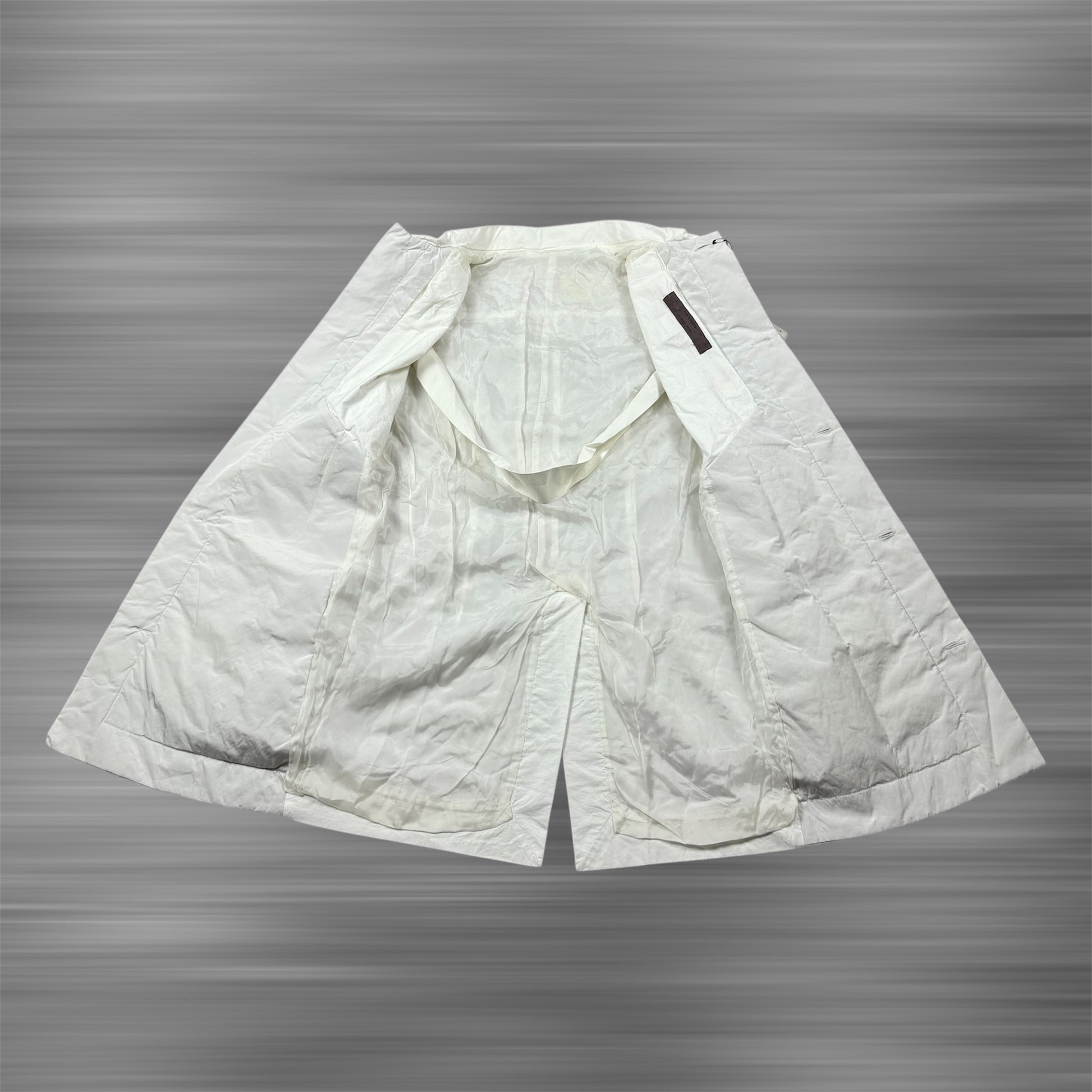 Rick Owens Naska SS12 shirt – longline, asymmetric, concealed buttons, paneled design. Lightweight, structured white fabric. Layered, monochrome aesthetic. Rare, collectible piece.